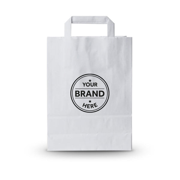 Bespoke printed paper bags with handle (Internal tape handle). PackGenie.co.uk supplies many catering and retail business' high-quality printed paper bags. Our 1 colour custom print range of white / brown handled paper bags have been specially developed with our customers in mind. We understand low volumes, fast turnaround and brand image are important to you. This is why our 1 colour custom printed paper bag range offers a large print zone in the middle of the bag, printed in your choice of 1 colour - this keeps cost down and production times quick. Branded takeaway packaging is great for helping your brand stand out, and keeping up with changing marketing / promotions. No matter if its for your coffee shop, cafe, hotel or promotional event. 100% recyclable and are made from paper sourced from sustainably managed forests. Suitable for takeaway food and retail. New artwork is subject to a ONE OFF origination charge added separately during checkout - As long as artwork stays the same for repeat orders.