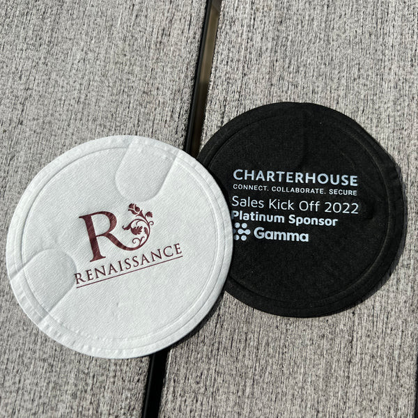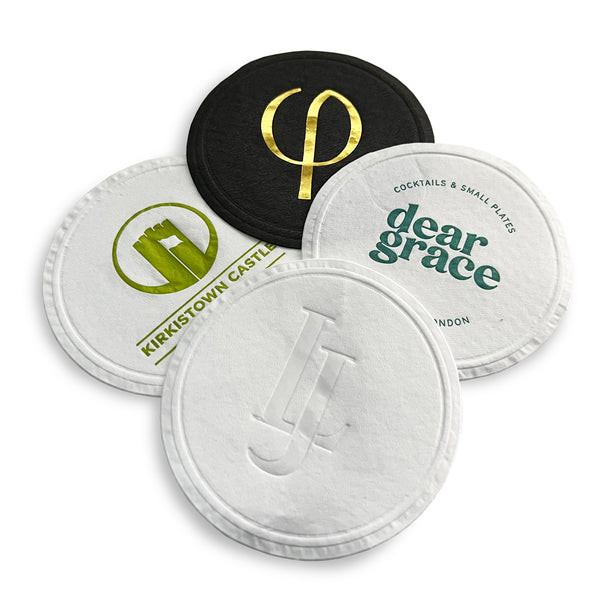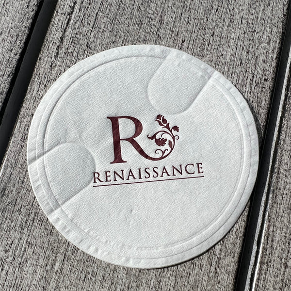 Printed Wax Back Coasters are a simple way to promote your brand. Our Round Wax Back Coasters can be printed in your choice of 1 colour or foil on white or black coaters to suit your branding. Available in round shape coasters with a wax base to stop drinks from slipping and capture light spillage. Low minimum orders gives you the opportunity to change designs frequently so you can regularly update promotions, offers and events. Elegant look and perfect promotional packaging for hotels, bars, pubs, gyms, businesses and much more. 100% Recyclable and biodegradable.