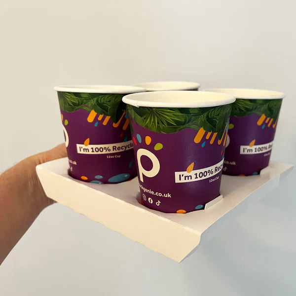 Drink carriers that carriers 4 cups. Increase speed of service - simple, quick & easy for staff to use. Takes up minimal space behind the bar / counter, carriers arrive flat. Made from strong cardboard designed to carry 4 x beer cups or coffee cups, our drinks carriers are 100% recyclable, compostable and STRONG!