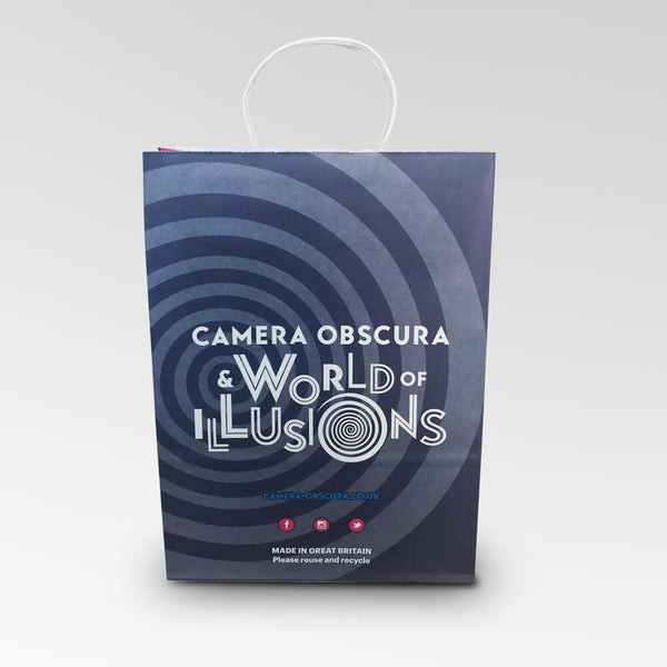 Custom printed twisted handle paper bags - A very popular choice for boutique shops and stalls looking for a more premium look. Available in brown kraft and white colours to suit your brand values. Sustainability is at the forefront of people purchasing decisions so its important that your branded bags mirror your commitment to the environment. Furthermore our printed twisted handle bags are very strong and will be sure to catch people attention. If your business is looking for eco friendly bags with handles for your products to be taken home then look no further. Personalise your handle bags with your logos, branding, imagery and marketing material. We print your twisted handle paper bags using the most up to date printing techniques so you can rest assured your bags will be sure to get noticed when your customers are walking with them.