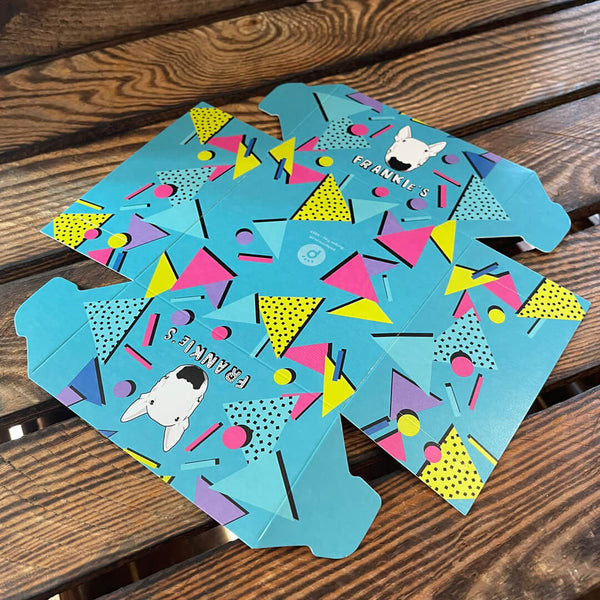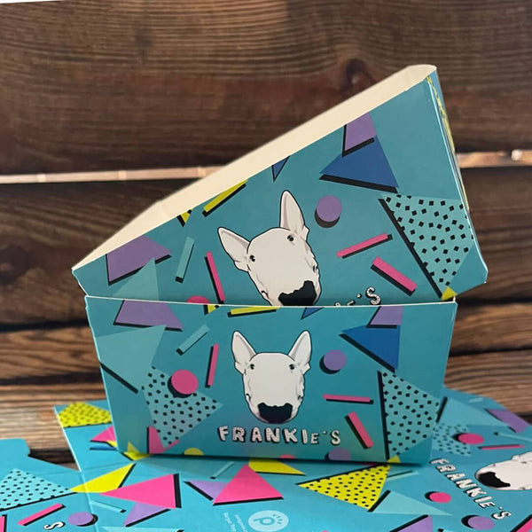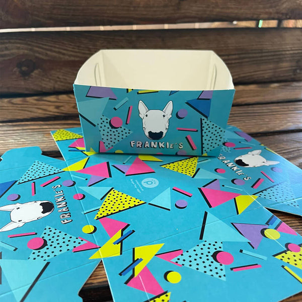 Custom burger trays - open. Personalised with your logo, branding or marketing material. Perfect for serving burgers. Our printed burger tray have an open top, great if you customers are eating close by. Custom burger trays are made from sturdy 490mic (280gsm) Folding Box Board which is widely recycled. Delivered flat pack, so take up minimal storage space. Easy to make up on the fly or whilst prepping. Printed in 4 colour CMYK, delivered in only 2 - 3 weeks from artwork sign off.